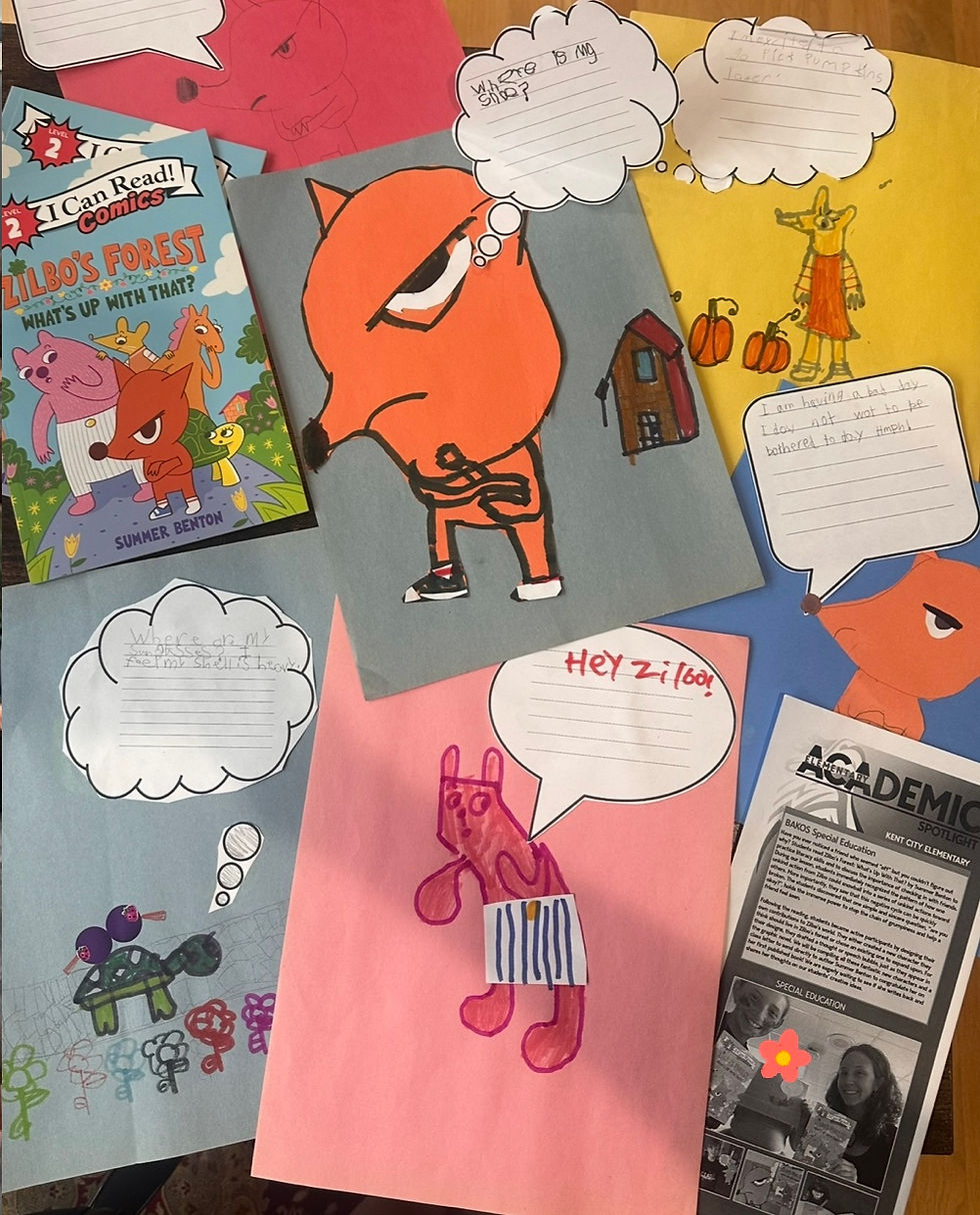 I recently received my first-ever fan art from the wonderful artists at Kent City Elementary! Ms. Bakos read my book, Zilbo’s Forest: What’s Up With That, with her special education class, and afterward the students created their own artwork inspired by the story. They even added word and thought balloons in the same comic style as the book.